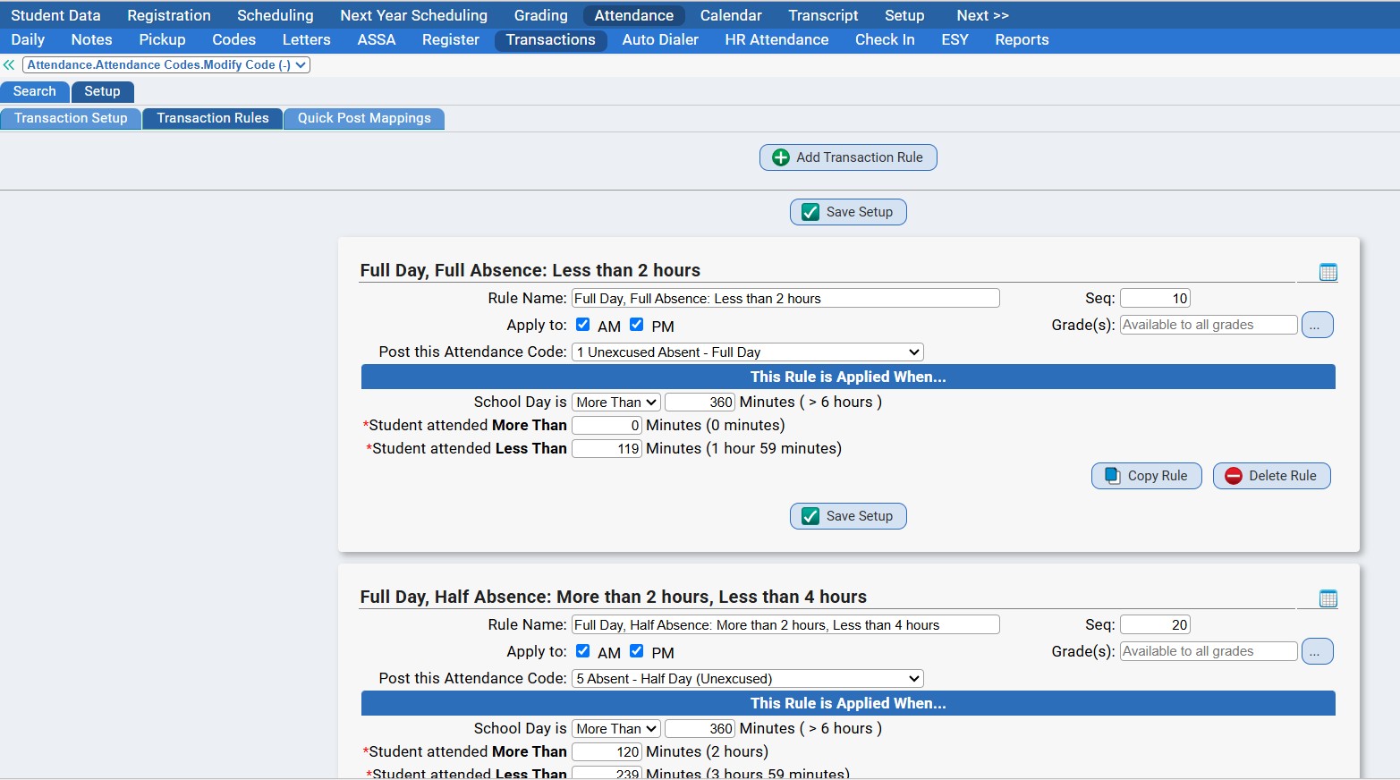 Transaction Rules allow you to create parameters on how long a student needs to be in school for any given day.