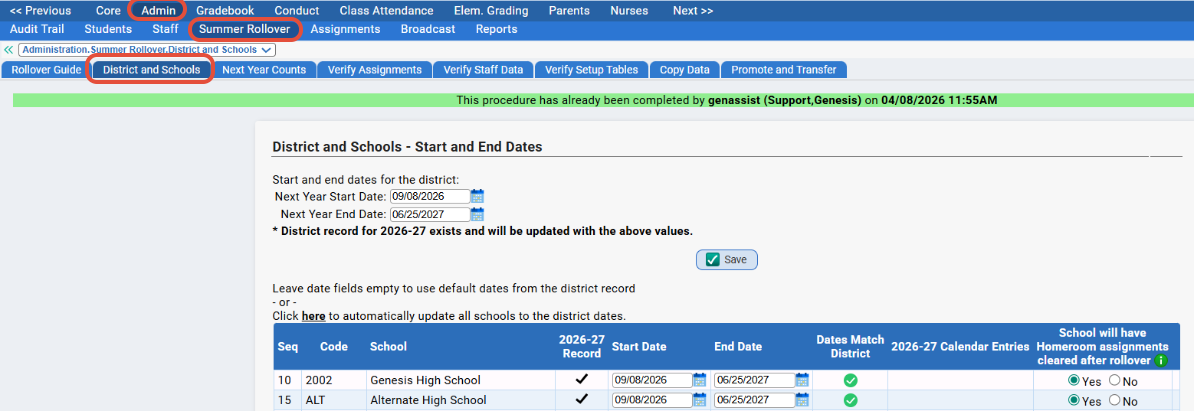 The first time you visit the Next Year Scheduling>Process Control screen you will be redirected to Admin>Summer Rollover>District and Schools so you can set the next year start and end dates for you District and Schools.