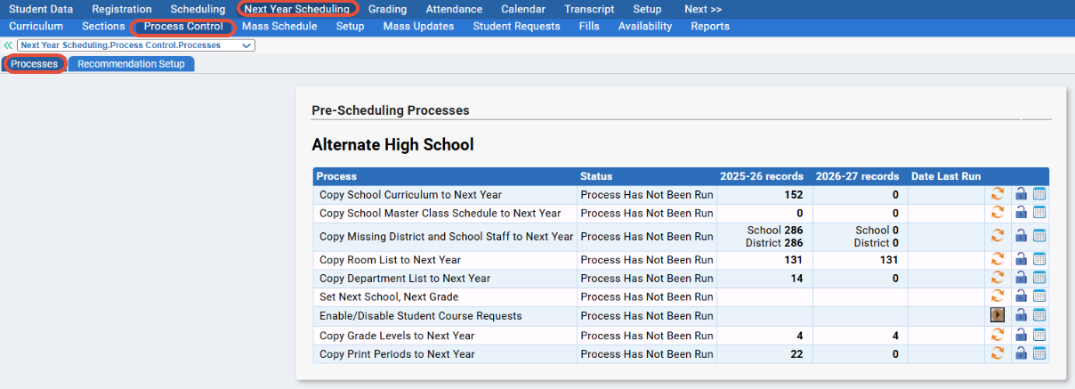 - TIP: If you notice that specific tasks are MISSING from this screen for a school, go to Next Year Scheduling>Setup>Processes. From there, you can select the school on the left, and then check off the missing task on the right. Click Save - and you should then see the task on the Next Year Scheduling>Process Control>Processes tab.