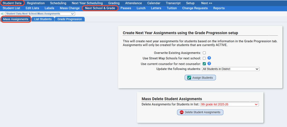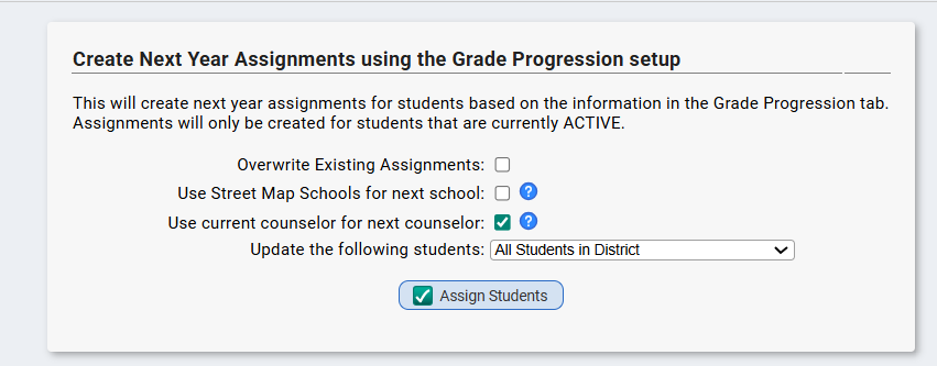 - This screen will create next year assignments based on what is set up within the Grade Progression table described above. Simply click 'Assign Students' to assign the next school and next grade values to all students based on the Grade Progression.