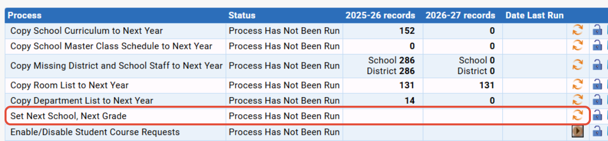 - First, you need to ENABLE this 'Set Next School, Next Grade' process via Next Year Scheduling>Process Control>Processes.