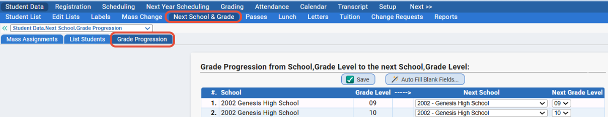 - Then, before doing any mass updated, be sure to double check the Grade Progression table to ensure it is setup properly via Student Data>Next School and Grade>Grade Progression.