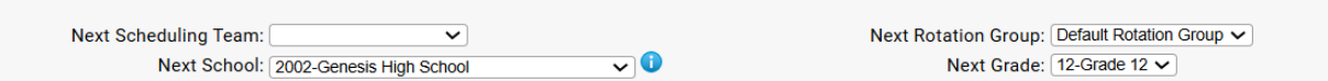 - If you need to manually override a student's 'Next School' and 'Next Grade' field, go to the student's Student Data>Modify Student>Demographics>Required page. These two fields are at the bottom of the screen.