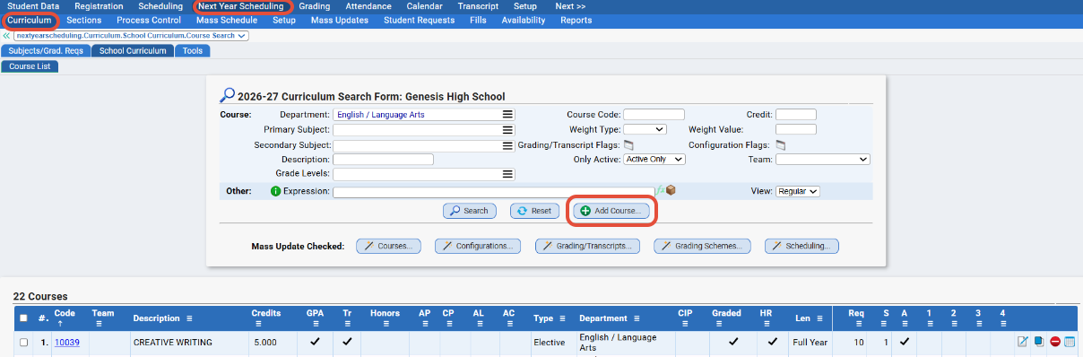 - Add/Delete course codes and make any necessary changes to your Next Year Curriculum via Next Year Scheduling>Curriculum>Modify Course.
