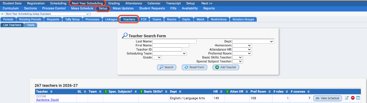 The Next Year Scheduling>Setup>Teachers screen is where all of your teachers (in Next Year) are located.