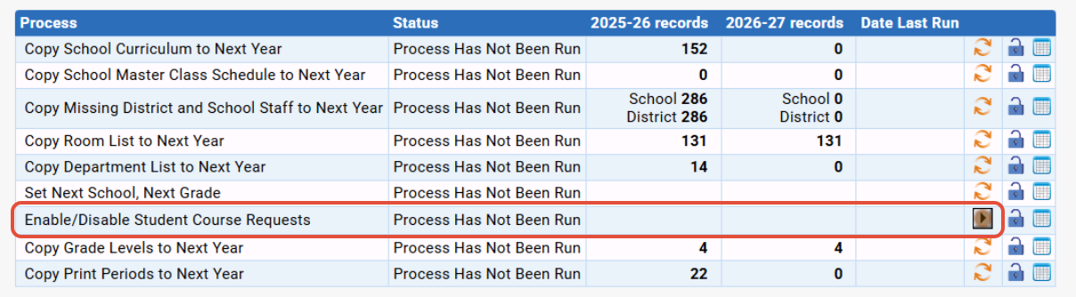- Begin collecting student requests by first enabling the process via Next Year Scheduling>Process Control>Processes.