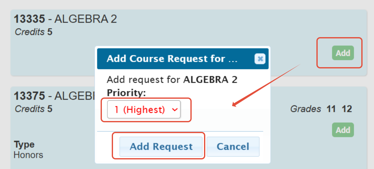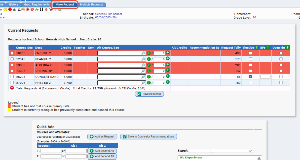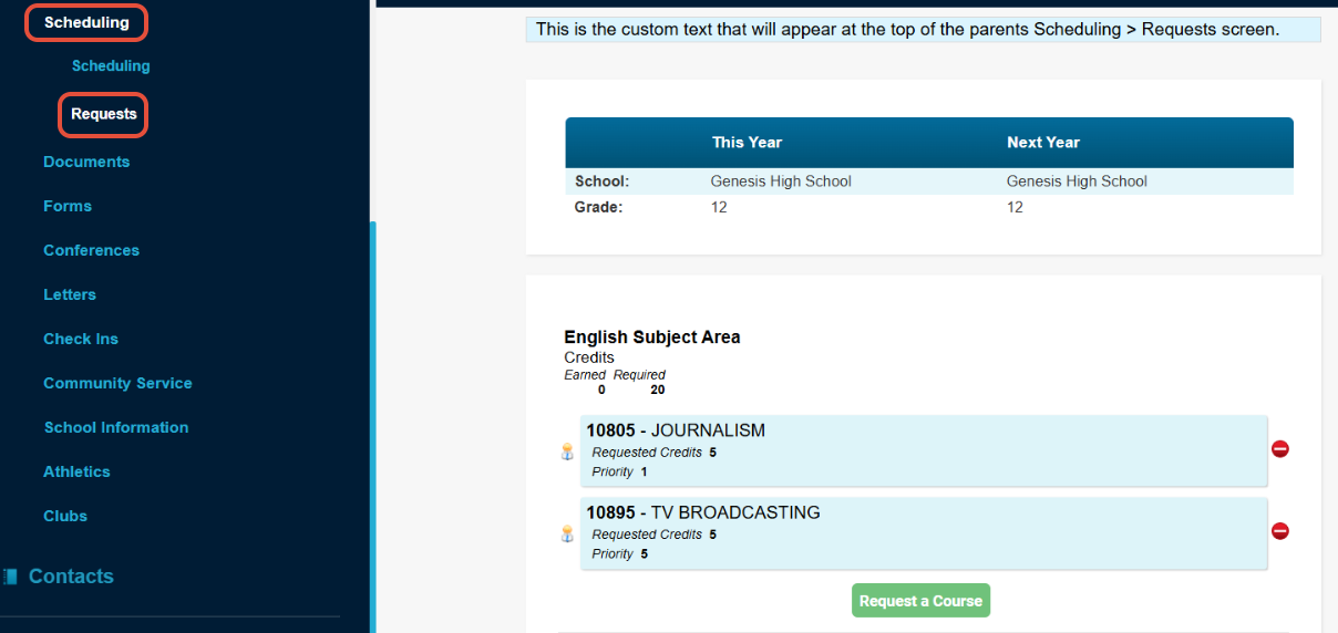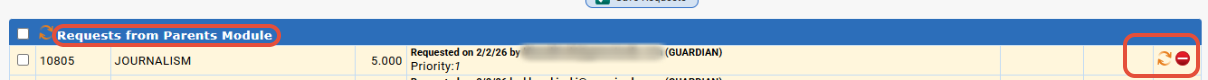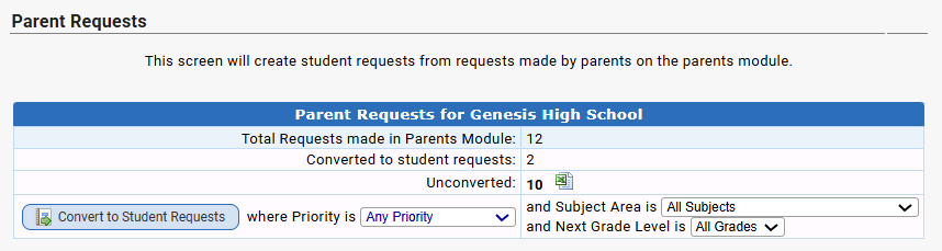 - Admins/counselors would need to MAKE the parent requests actual student requests. You can do this from the Student Data>Modify Student>Next Year Request screens and/or en masse from the Next Year Scheduling>Student Requests>Parent Requests screen.