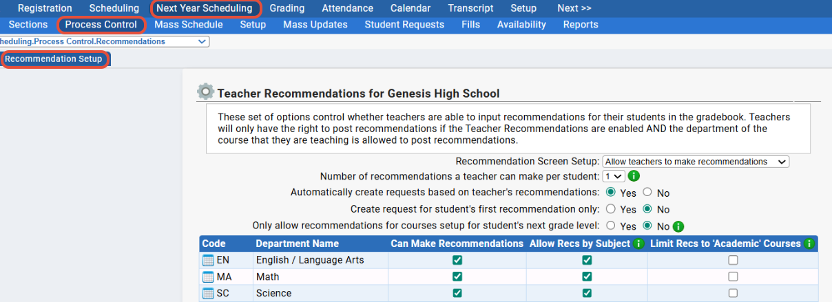 - You can control the setup of this screen via Next Year Scheduling>Process Control>Recommendation Setup