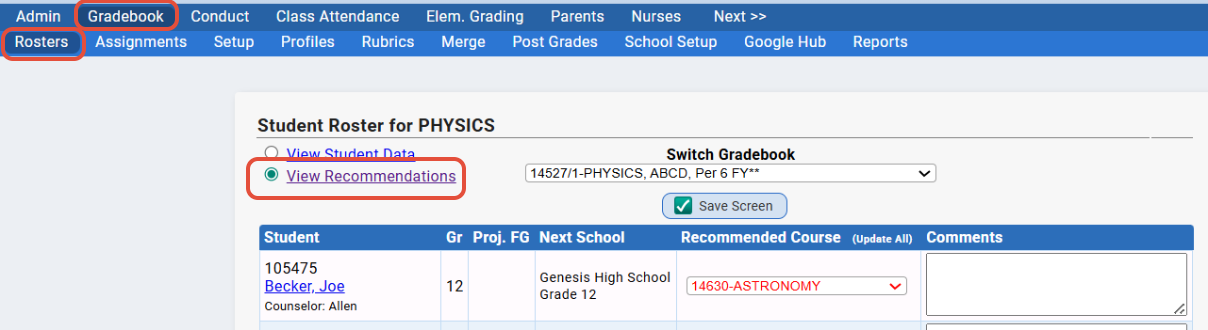 - Teachers can view and make recommendations through their Gradebook via Gradebook>Roster>Teacher Recommendations