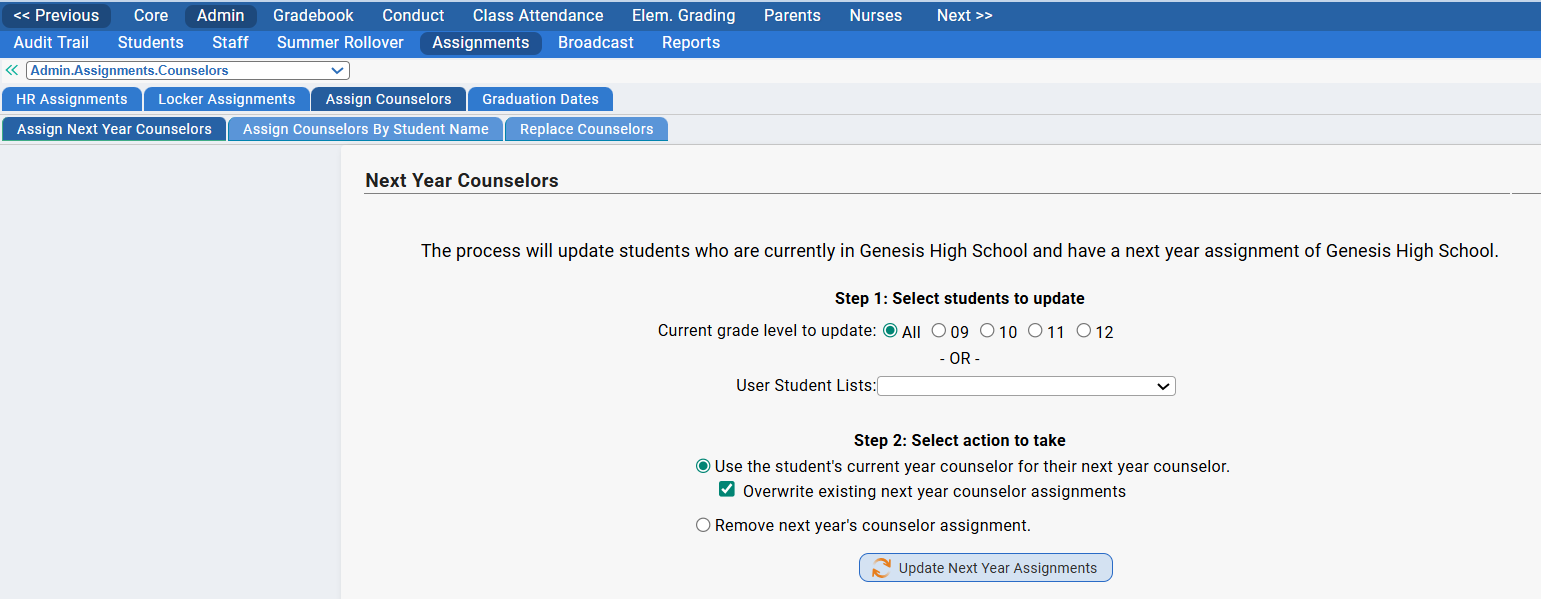- Assign Next Year Counselors via Admin>Assignments>Assign Counselors>Assign Next Year Counselors