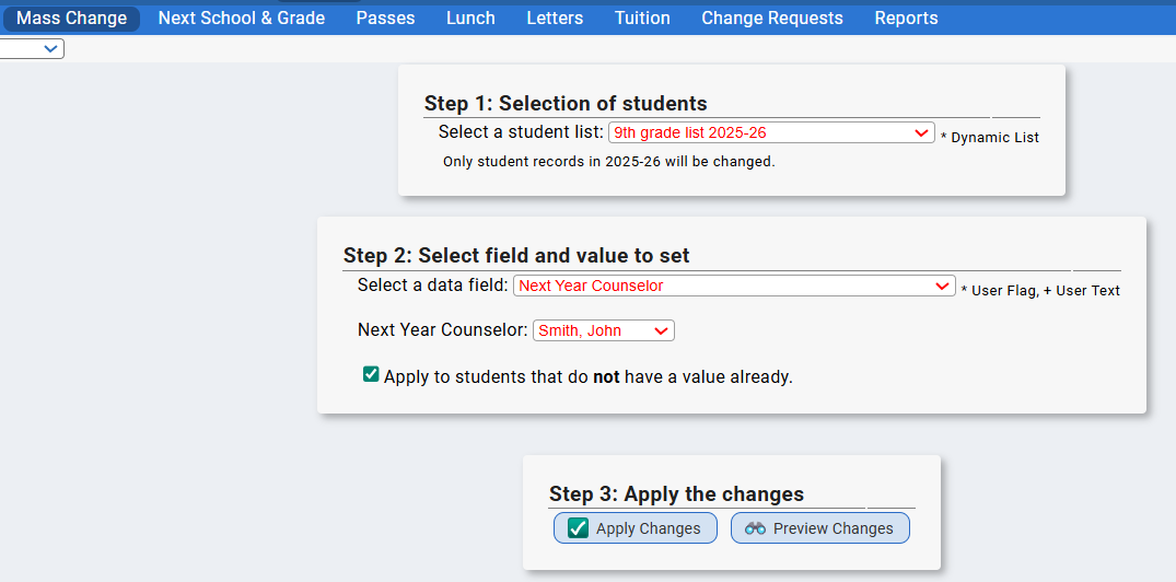 - You can mass assign Students a Next School and Next Grade via Student Data>Next School and Grade>Mass Assignments.