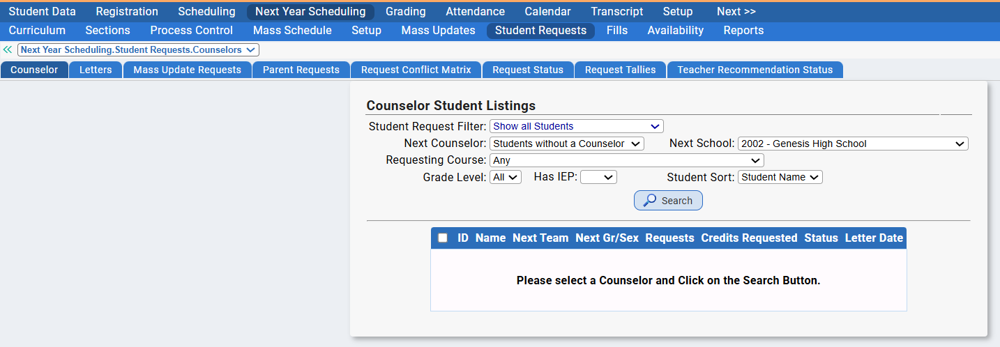 - Students without a Counselor can be viewed via Next Year Scheduling>Student Requests>Counselor