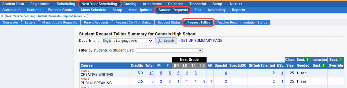 Next Year Scheduling>Student Requests>Request Tallies