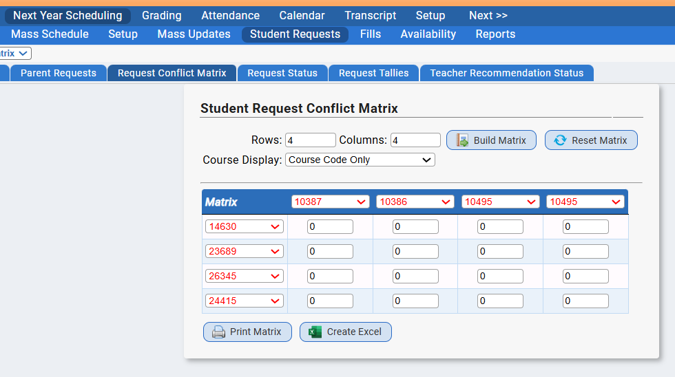 - Next Year Scheduling>Student Request>Request Conflict Matrix