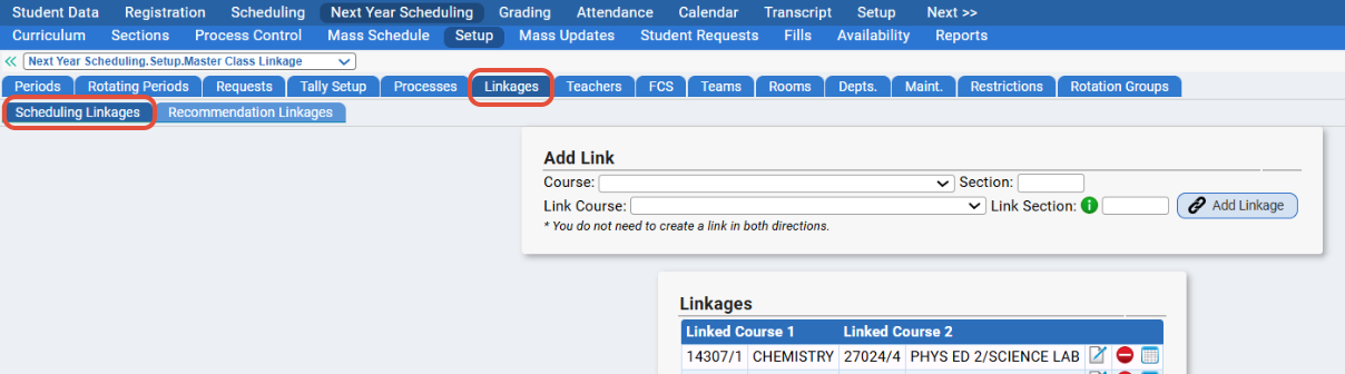 - You can link specific course sections together via Next Year Scheduling>Setup>Schedule Linkages