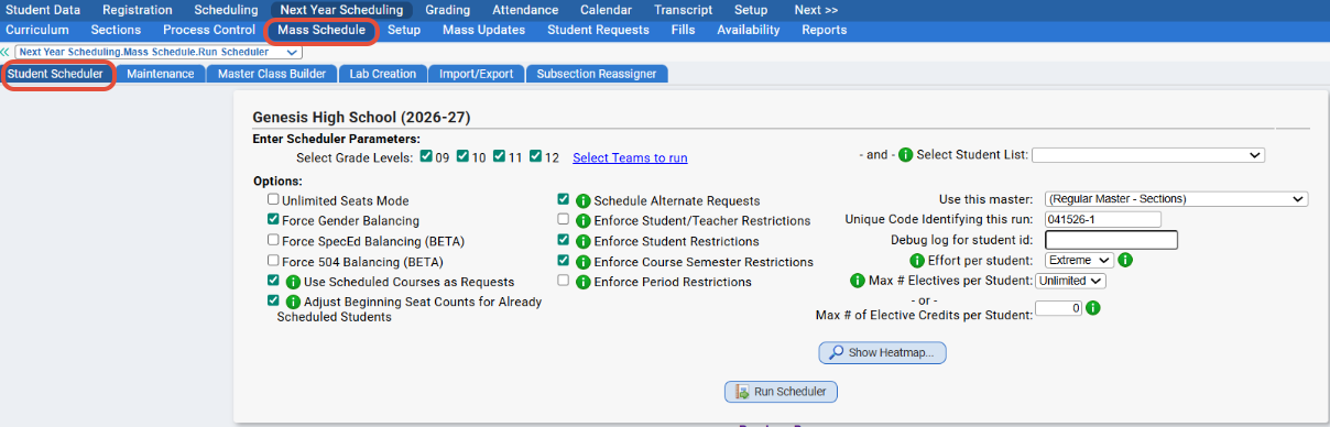 The Student Scheduler will process student requests and create the best possible student schedules for the school via Next Year Scheduling>Mass Schedule>Student Scheduler