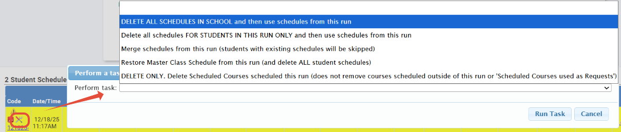 - Restore Master Class Schedule from this run- This option will return the Master Schedule (this is your sections) back to what they were at the time of the scheduling run that you have selected.