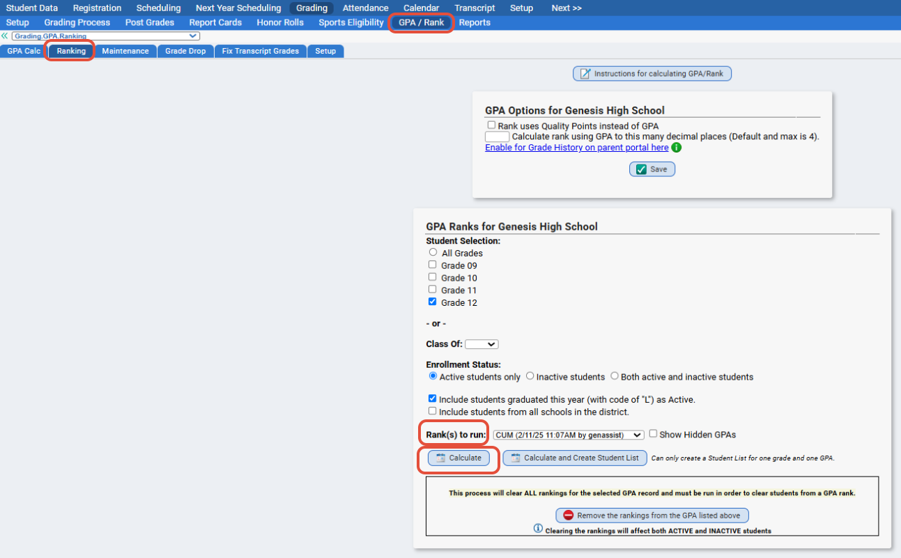- After this has calculated, navigate to Grading>GPA/Rank>Ranking.