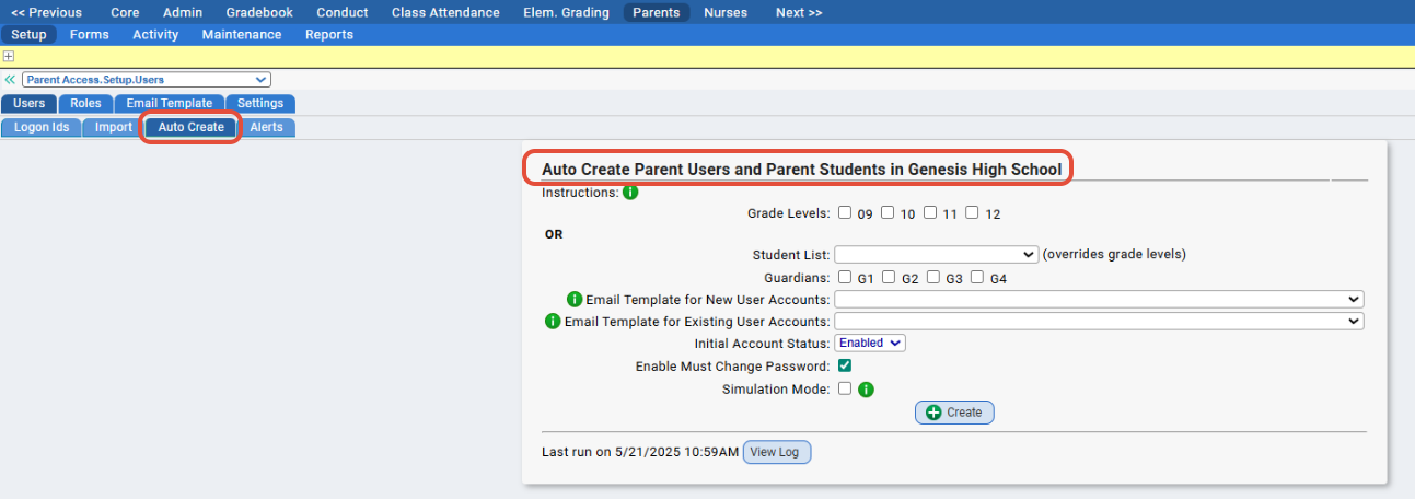 - Navigate to Parent Access>Setup>Users>Auto Create.