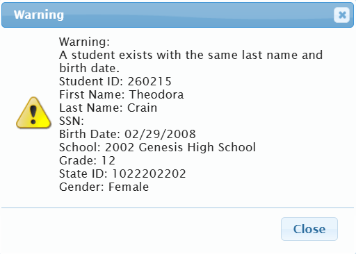 Note: after you enter the preliminary info for the student (such as Name, Birth Date, and Gender etc) - you can click the “Does Student Exist?” button at the bottom of the screen. If a student matching this student’s basic information exists, a warning will be displayed.