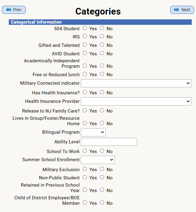 The Registration>New Student screen is used when a new student registers in the District for the first time to attend school in the current school year.