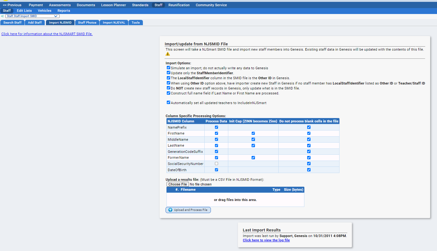 Now that you have updated all of your staff in Genesis with the proper Payroll/HR id #, you can import the SMID file from the Staff>Staff>Import NJSMID screen.