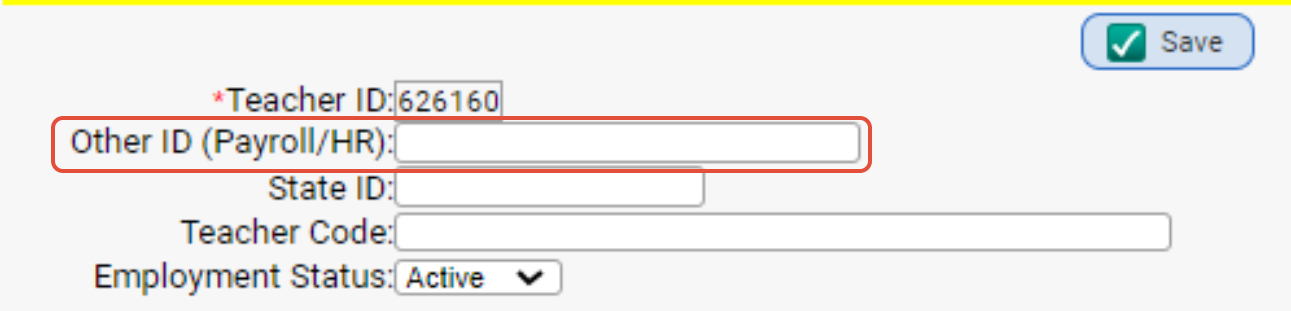 If the LocalStaffIdentifier in the SMID file is not the same as the Teacher ID In Genesis, then you can place the ID # from your HR/Payroll system into the Other ID field.