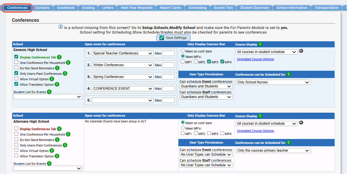This settings screen can enable you to allow parents and/or students to schedule conferences with your staff.