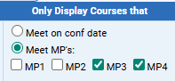 Only display courses that | The course display controls what courses are shown to the parent user when requesting courses. By default, only courses who meet during the marking period of the conference date are shown on Reserve Conference screen. For instance, if a conference falls on 11/19 and that date is in MP2, then only courses that meet during MP2 will be available for conferences. By selecting the "Courses meeting during selected MP's" option, you can specify marking periods for the courses that will be displayed. So if you want to have conferences after MP1 for your MP1 courses, you can select this option and choose MP1. Now only courses that meet during MP1 will be displayed on the Reserve conference screen. |