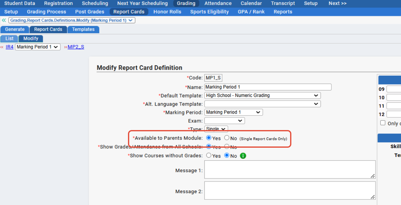 This Parent Access>Setup>Settings>School Settings>Report Cards tab controls which report card is being displayed on the Grading screen in the Parents Module.