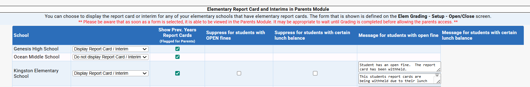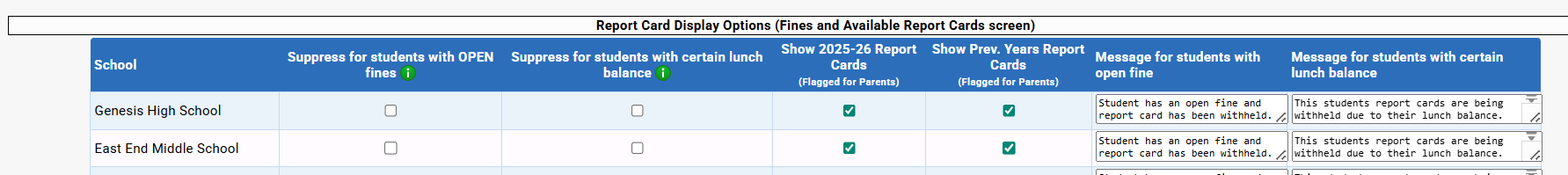 Suppress for students with OPEN fines | This option will suppress reports cards for student's with OPEN fines. |