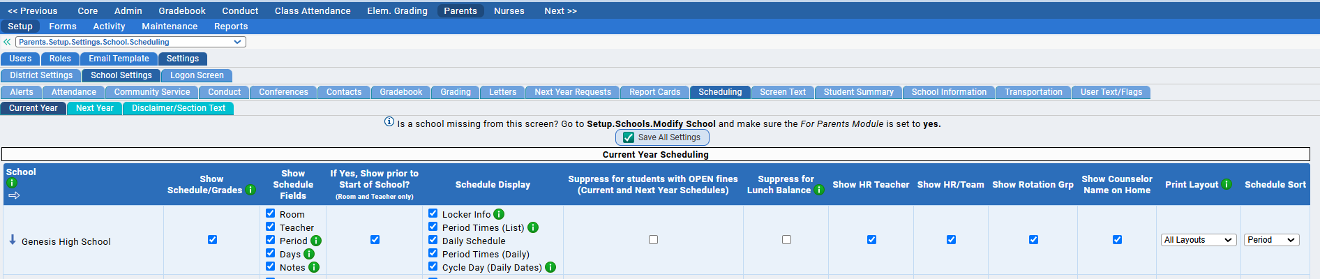 Additional scheduling-related fields found via Parent Access>Setup>Settings>District Settings: