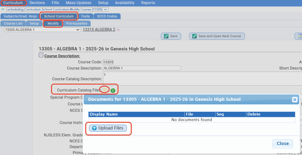 Click the folder icon to upload files that can be accessed on the School Curriculum Catalog screen in the parent portal.
