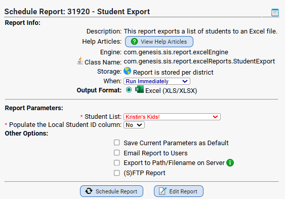 - Run the Student Export report based on the student list you created. These reports can be found via: Registration->Reports
