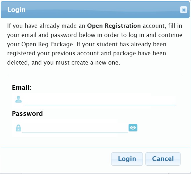 Once a parent has a username and password, they will be able to enter them into the Open Reg login page to continue with their existing Open Reg package.