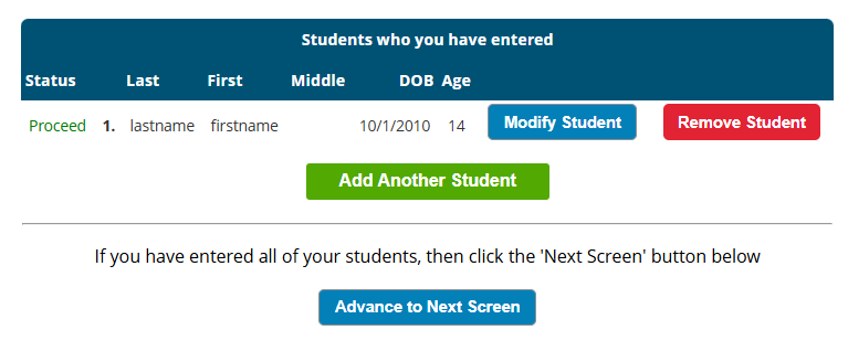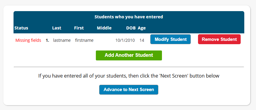 After submitting a student they will appear in a table. There is a status column informing you if you missed any required fields. If you have missed required fields, it will say “Missing Fields” in the Status column on the next screen. Click “Modify Student” to go back to the previous screen to finish adding the required items. | Once the student has all required fields filled in their status will be complete. At this point, if you have additional students to enter, click “Add Another Student” and complete the same process you did for the first student. If you have no missing items, it will say “Proceed” in the Status column, and you can click “Advance to Next Screen.” |