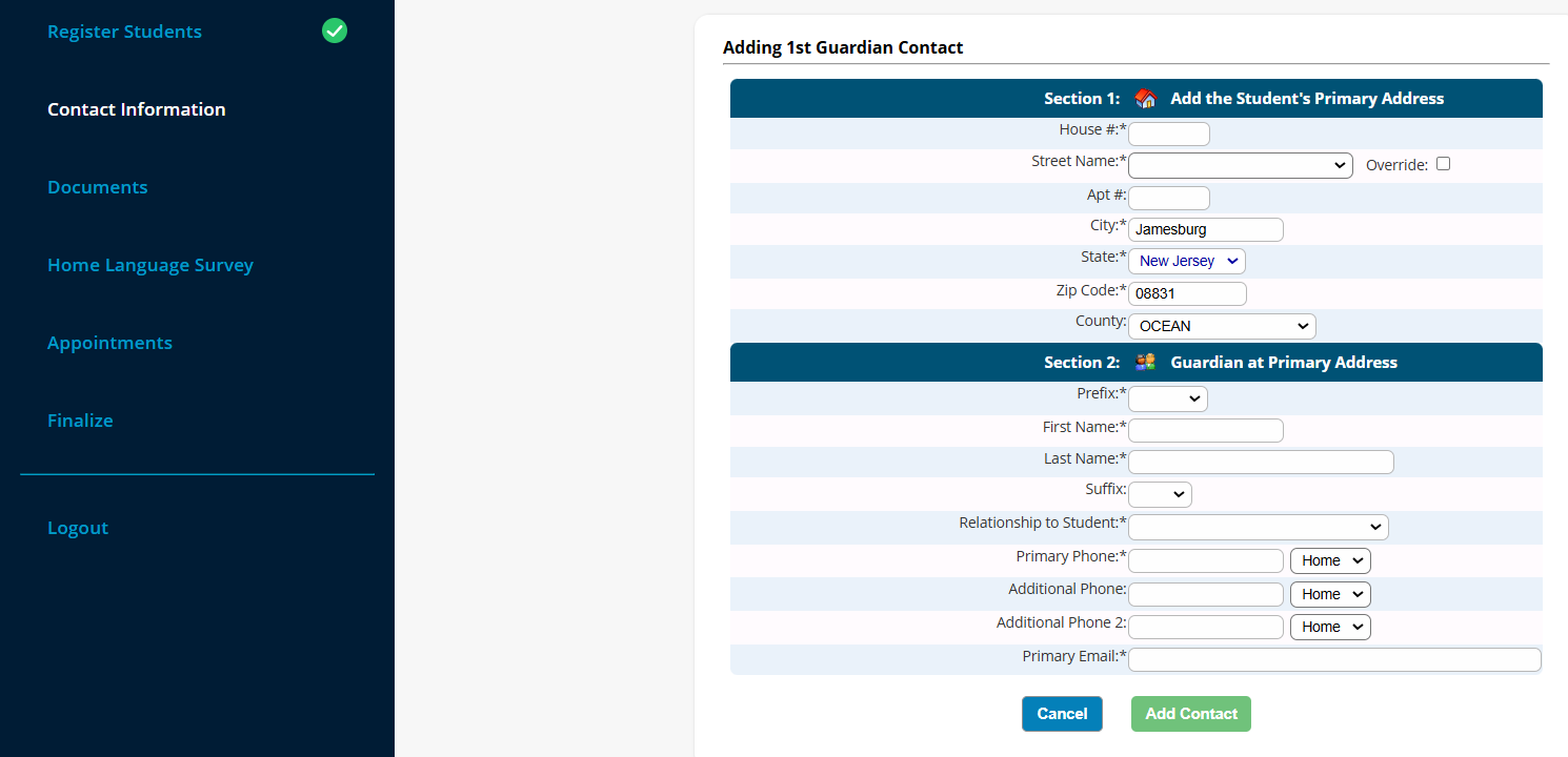Click “Add Primary Address and Primary Parent/Guardian” to get started.