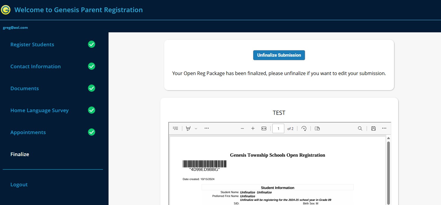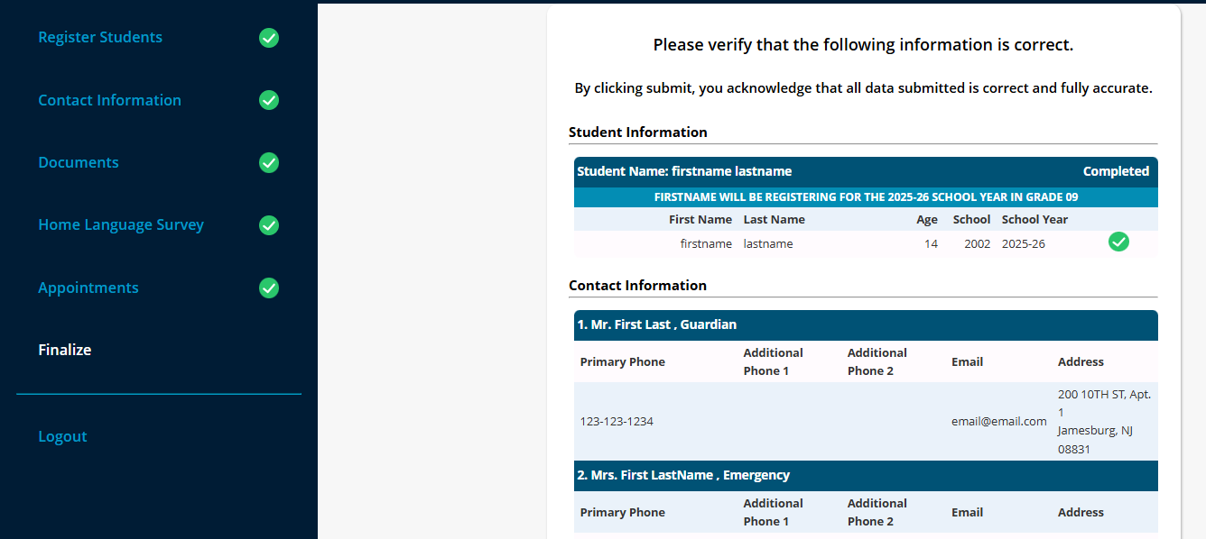 After successfully registering you will be shown this screen, and must click the Finalize button to send the information to the district: