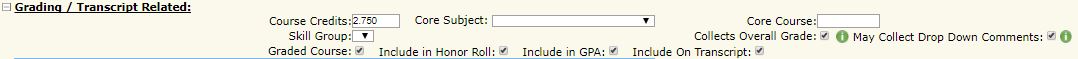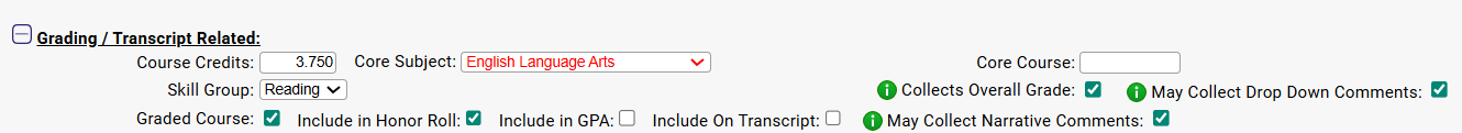 - Core Subject report cards require the courses to have the "Core Subject" and "Skill Group" filled in. This is found on the Curriculum file itself - via Scheduling>Curriculum>Modify Curriculum. Review the course on that screen to ensure this info is filled in.