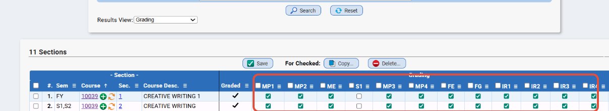 - Go to Scheduling>Sections>Modify Section. Make sure the appropriate Grading collections are checked off for the section. For example, if it is just an S1 course, make sure only MP1 and MP2 are checked off to be collected. If MP3 and MP4 are checked off, the system will be waiting until grades are entered for THOSE two marking periods before automatically calculating an FG. If some are missing, check them off and save. If some are not needed, uncheck them and save.