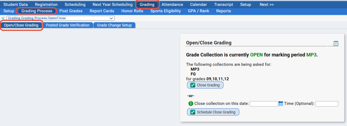 The Grading>Grading Process>Open/Close Grading tab allows you to select which grade collections are currently open and available for teachers to post grades for.