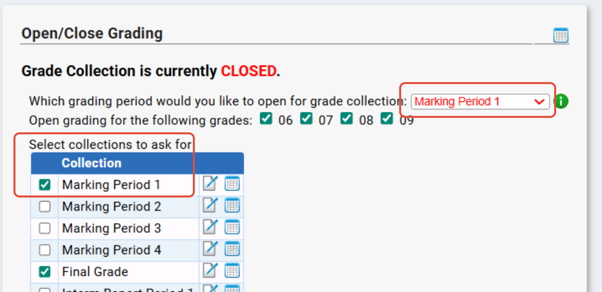If you need to make a change to the collection open for grading or being asked for, you need to select the marking period in the "Which marking or interim period would you like to open for grade collection" dropdown.
