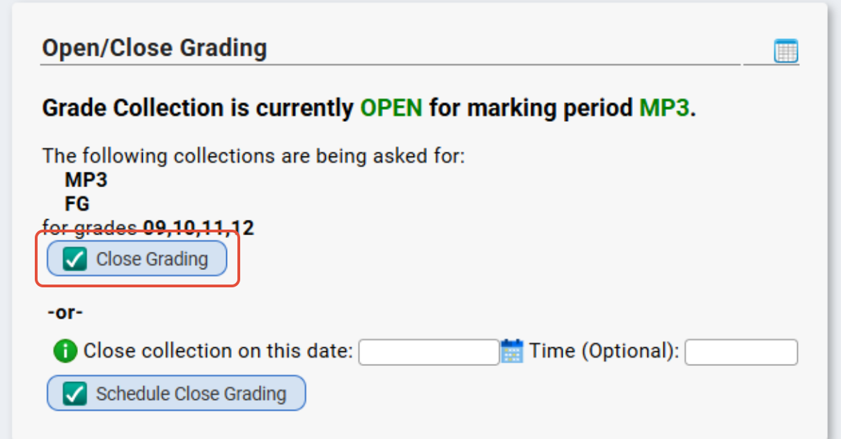 If it is currently open for a specific marking period/collection, and you need to make a change or just close it out, you will need to click the "Close Grading" button.