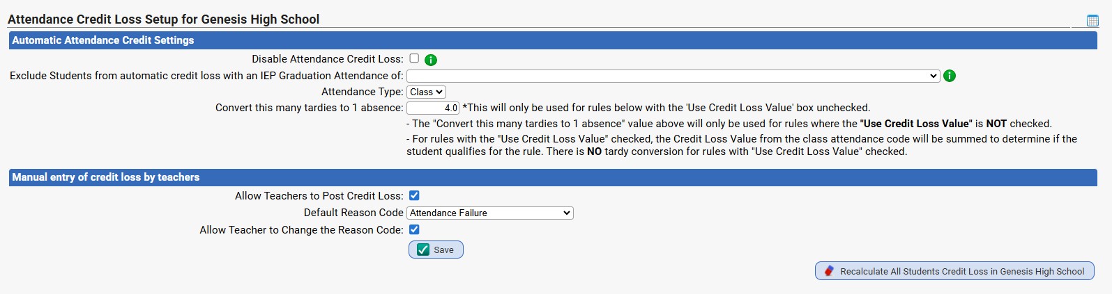 Automatic Attendance Credit Loss is enabled by creating “Credit Loss Rules”. If there are rules in place, it can be disabled by checking off Disable Attendance Credit Loss option.