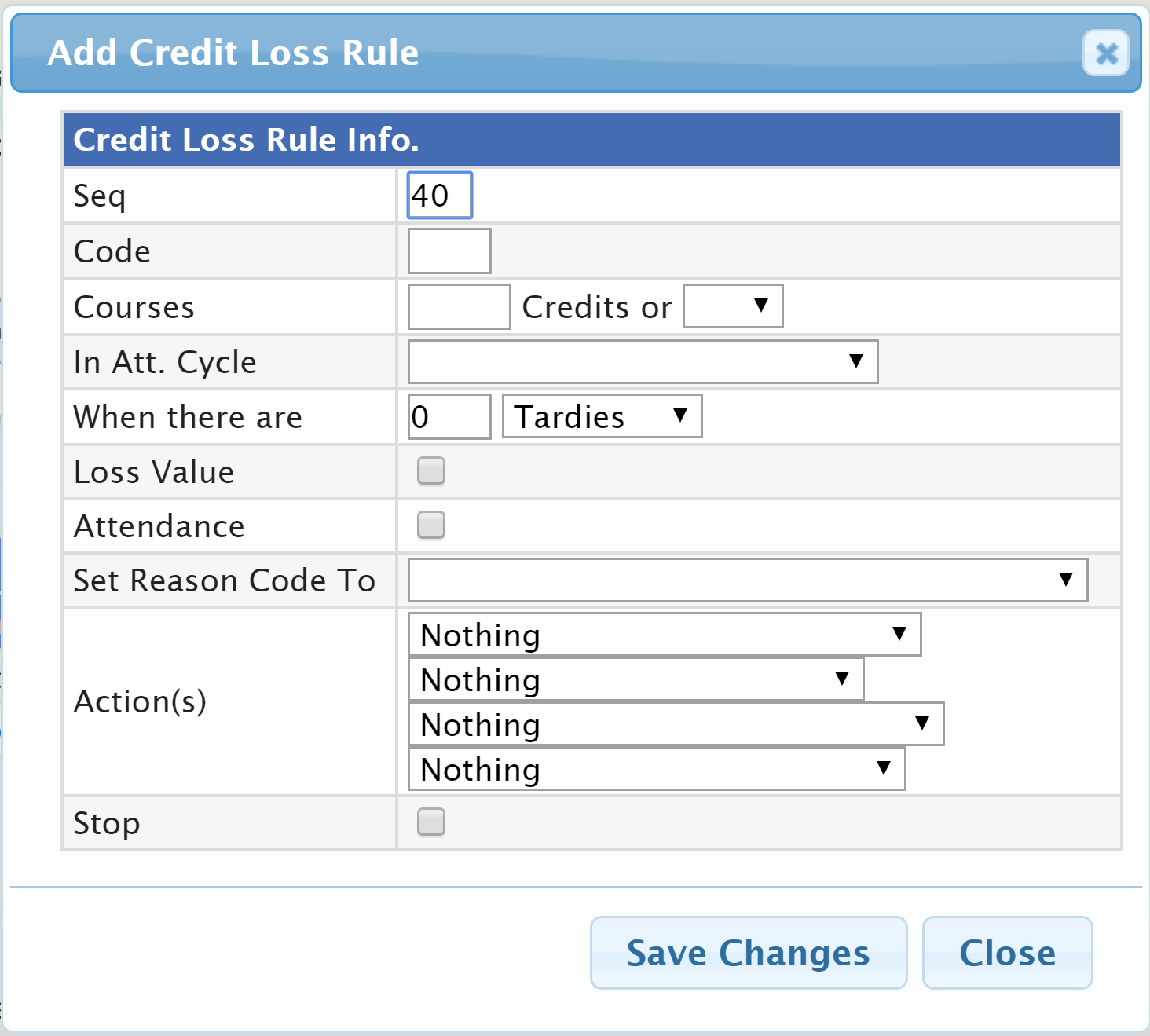 Example: The rule above matches Full Year courses where students have 8.2 or more absences for the entire year. The earned credits are set to zero. The student loses credit for the entire course and receives a ‘reason code’ of “Attendance Loss - Full Year”