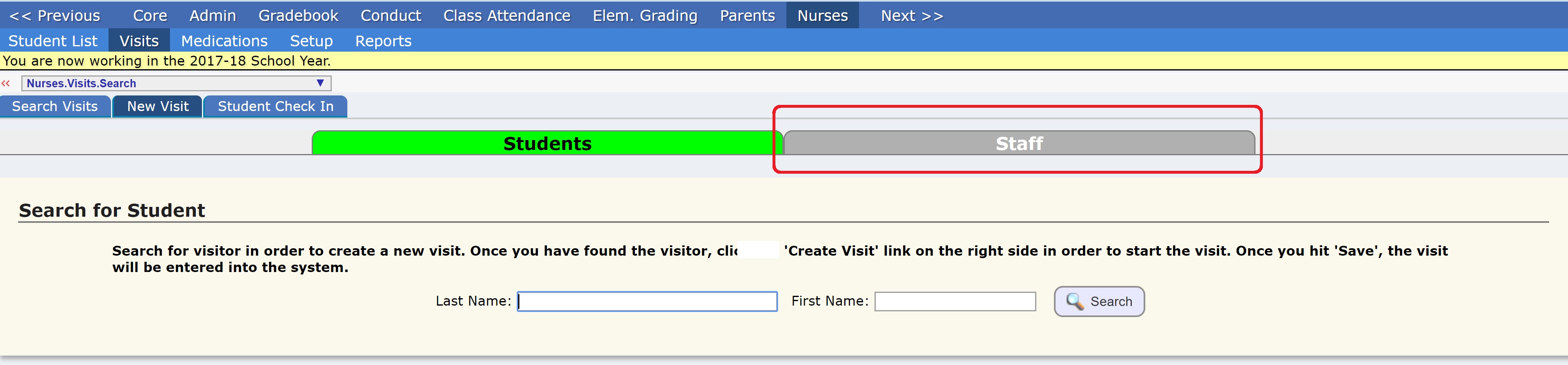 If the Staff tab does not appear, your security roles lack the nurse.visits.staff Securable Location.
