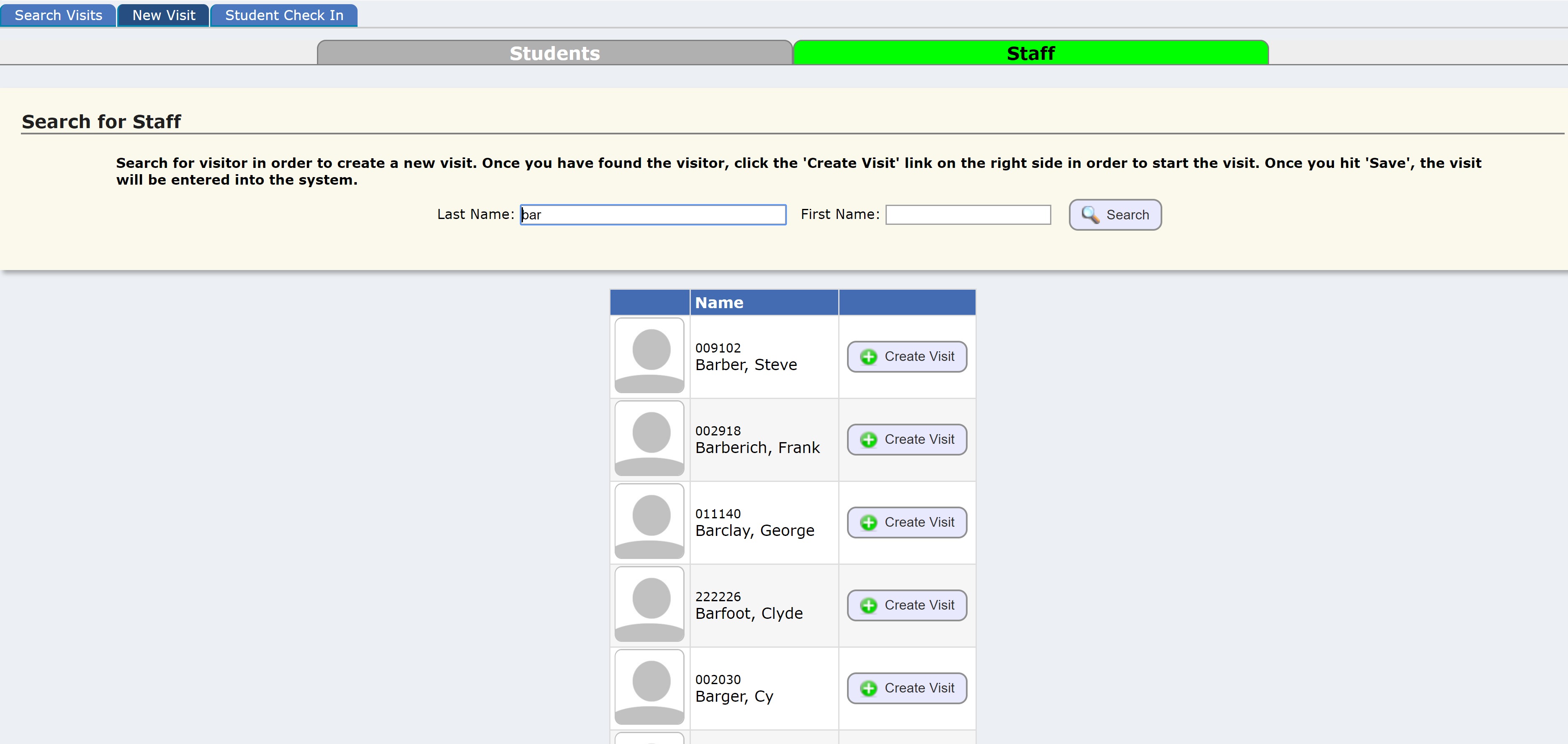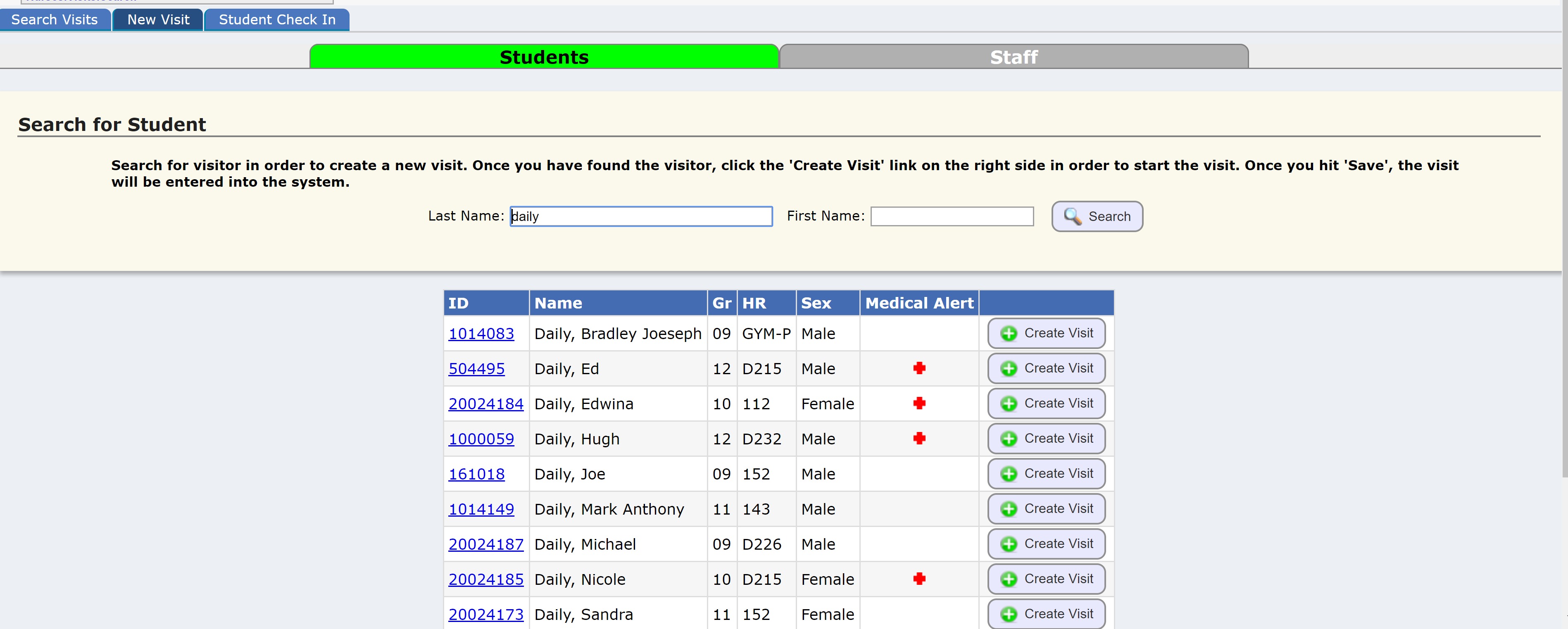 By default - without you needing to enter any search criteria - this screen automatically finds all open visits, that is, all individuals (students and staff) whose visit record indicates they are in the nurses' office right now.