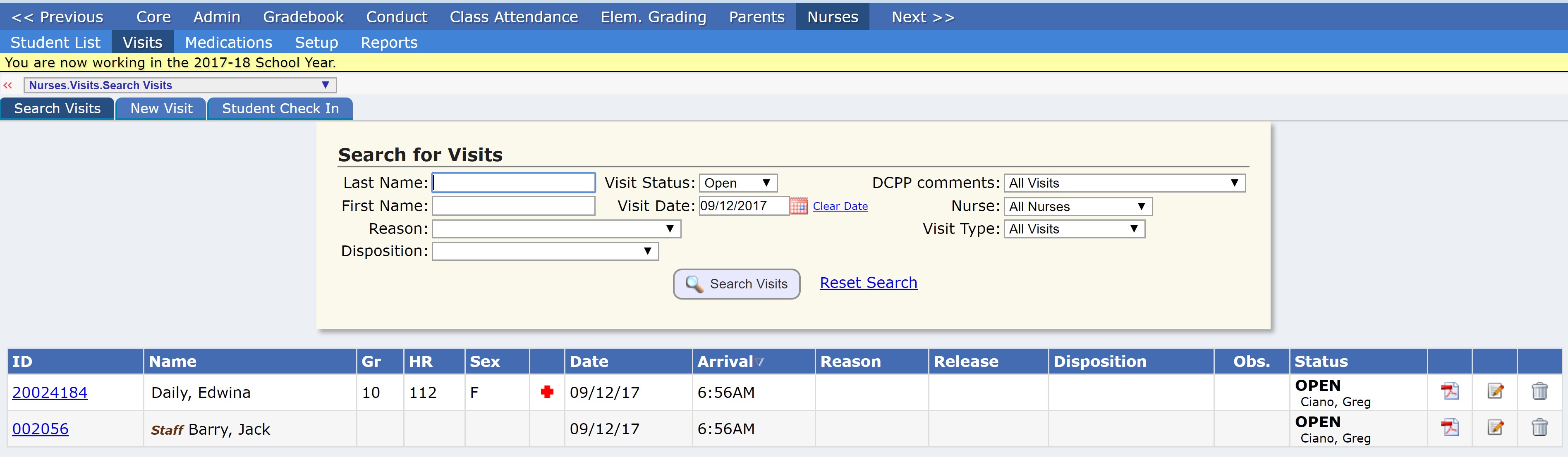 The nurse visit Search screen is general purpose 'visits search' screen optimized to show you the students and staff members who are in the nurses' office right now.