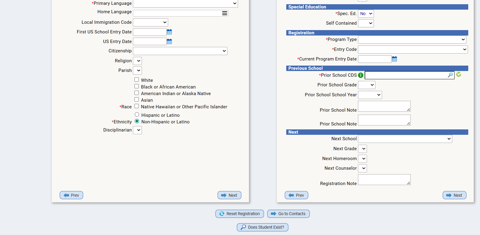 Note: The primary difference between New Student registration for the current year and Pre-registration for the next year is that with New Student registration the student is placed directly into a school and attendance records are created immediately to track their current year attendance. With Pre-registration, the student is placed in a ‘holding tank’ Pre-Registration school and does not appear in current year records. In addition, it is crucial to identify what school and grade the student is to be placed in for the next school year. There are no other real differences between the two functions. Just be sure to register a new student for the current year via Registration>New Student and/or to pre-register a student for next year via Registration>Pre-register. |