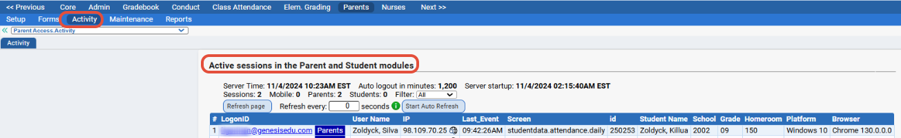 The Parent Access>Activity screen lists parents and students who are currently logged in to Genesis: